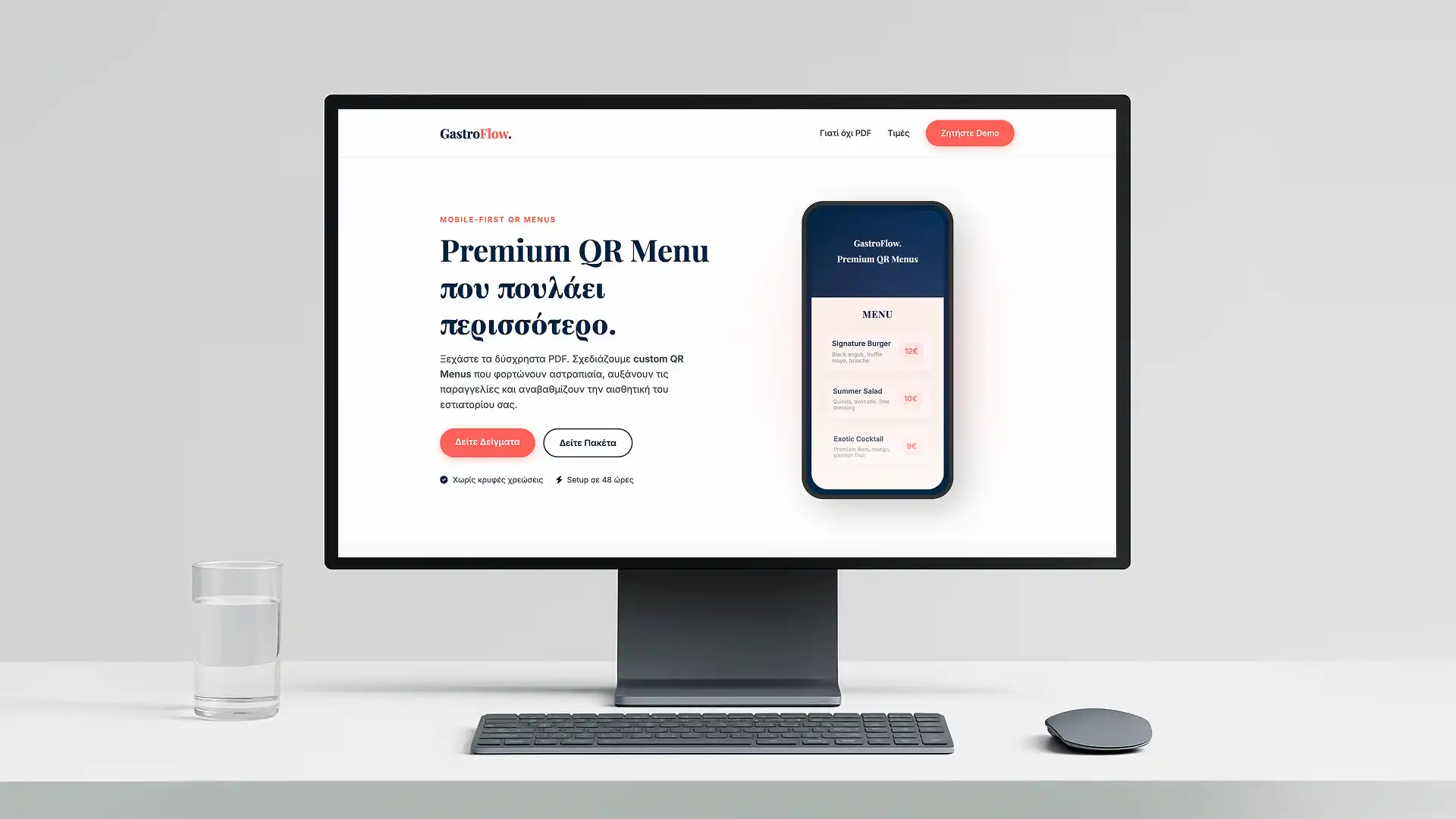 Μια premium ιστοσελίδα παρουσίασης για την GastroFlow. Σχεδιασμένη με έμφαση στην υψηλή αισθητική, την εύκολη πλοήγηση από κινητά και την ανάδειξη διαδραστικών QR καταλόγων που αντικαθιστούν τα δύσχρηστα PDF.
