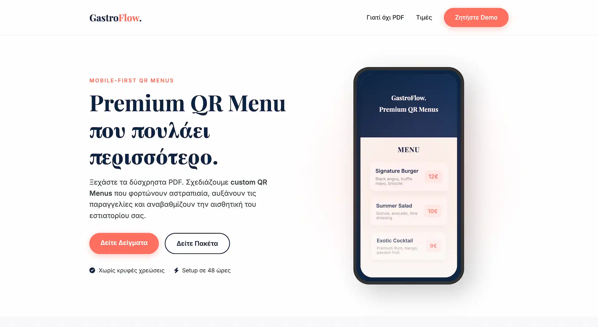 Μια premium ιστοσελίδα παρουσίασης για την GastroFlow. Σχεδιασμένη με έμφαση στην υψηλή αισθητική, την εύκολη πλοήγηση από κινητά και την ανάδειξη διαδραστικών QR καταλόγων που αντικαθιστούν τα δύσχρηστα PDF.