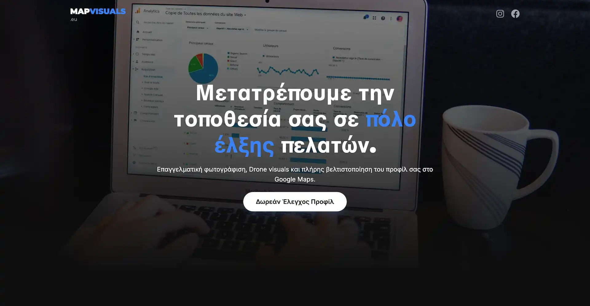 Μια δυναμική landing page παρουσίασης για το MapVisuals.eu. Σχεδιασμένη με έμφαση στη μετατροπή των επισκεπτών σε πελάτες, την άψογη εμπειρία σε κινητά συσκευές και την ανάδειξη υπηρεσιών Local SEO, που βγάζουν τις επιχειρήσεις από την ‘αφάνεια’ των χαρτών.
